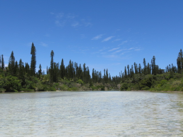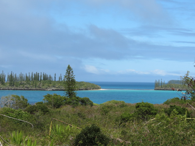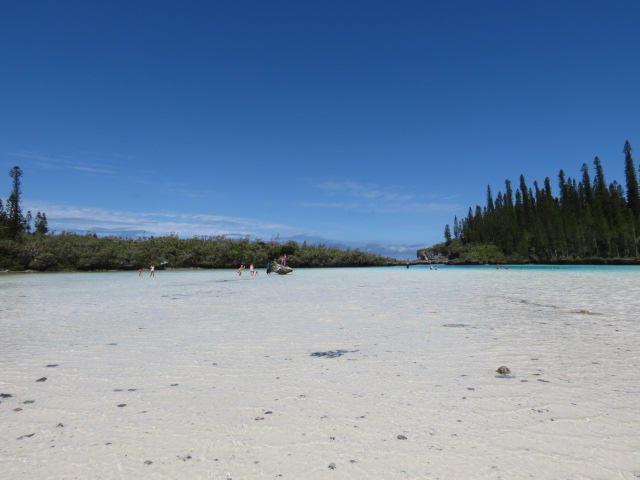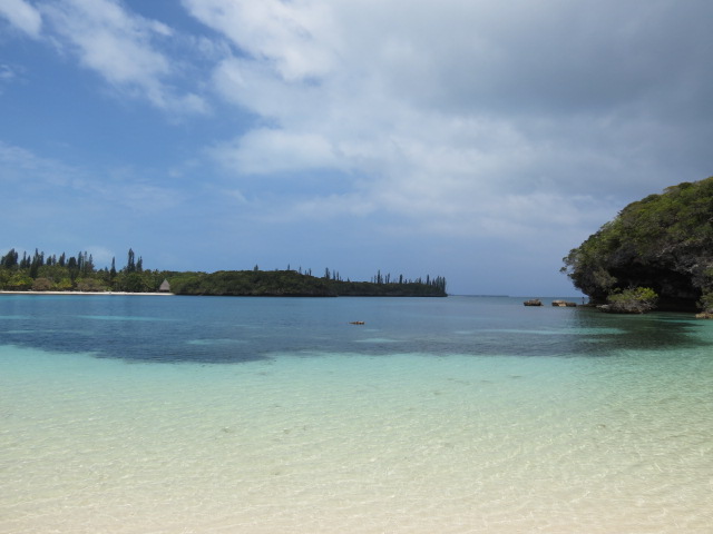 Suit la baie de Saint Joseph et l’ilot Ku Duu lui faisant face. Le beau temps commence à gagner du terrain. C’est de bonne augure car je me dirige à présent vers le site le plus emblématique de l’ile, à savoir la baie d’Oro et sa piscine naturelle. Cependant après avoir garé mon scooter et payé le droit de passage, je prends à contre courant le sentier pédestre qui relie la baie d’Oro à la baie d’Upi, la majorité des touristes arrivant par pirogue d’Upi. Un sentier en pleine jungle permet d’assurer la liaison entre les baies. 40 minutes de marches plus tard me voici arrivé à la baie d’Upi, qui a des faux airs de baie d’Along… Je suis l’unique privilégié à profiter de ce magnifique paysage, un moment vraiment unique pour la pause pique nique ! Je reprends le sentier afin de revenir vers la baie d’Oro et sa piscine naturelle, la carte postale de l’ile, eau turquoise, cernée de sable blanc et couronnée par les fameux pins Araucarias…