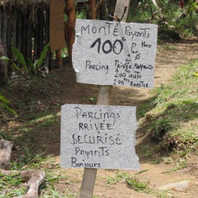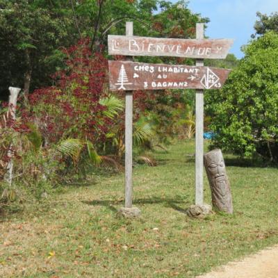 C’est déjà la fin de matinée et il est temps de se préparer à la petite randonnée du jour, à savoir l’ascension du Pic N’Gâ le toit de l’ile avec son sommet culminant à 262 mètres. Comme pour l’ensemble des sites de l’ile, je fais preuve de respect en payant mon droit d’entrée à la tribu en déposant ma contribution dans la petite boite prévue à cet effet… Je ne peux cependant m’empêcher de sourire en lisant les petits panneaux d’avertissement ou de bienvenue situés à l’entrée du sentier…