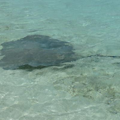 Comme convenu, départ ce matin pour une sortie sur le lagon. Le programme de l’excursion est simple, le tour complet de l’ile par le lagon qui l’encercle en pirogue, ponctué de plusieurs arrêts. La première étape est proche de notre point de départ. C’est une baignade en compagnie de raies Manta et de requins à pointe noire. La profondeur de l’eau est inférieure à 1,5 mètres rendant facile la baignade et l’observation sous marine équipé seulement d’un masque et tuba.
