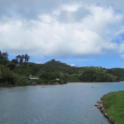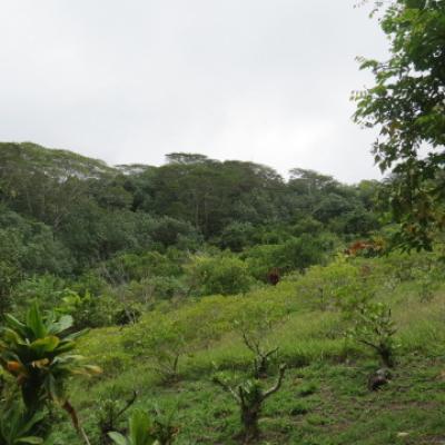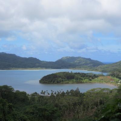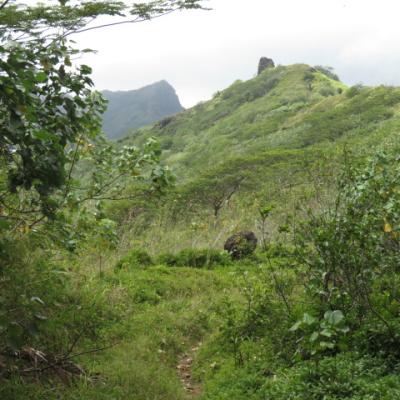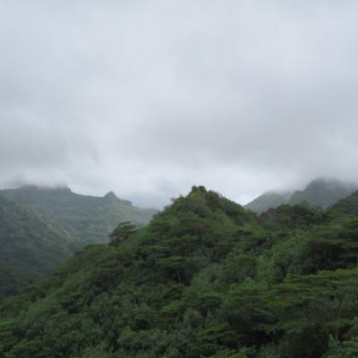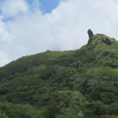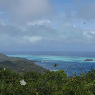 Dernier jour en Polynésie ! Et je conclue mon séjour par une randonnée. Tama est mon guide pour cette matinée, nous allons regagner le col des 3 cocotiers qui se situe au cœur de l’ile sur une des crêtes du cratère. Tama arrive avec plus d’une heure de retard au rendez vous fixé, et m’informe que la randonnée en raison des conditions météo est annulée. J’accuse un peu le coup, pensant sur le moment qu’il n’a plutôt pas envie de sortir pour un seul touriste… car bien que la météo ne soit pas exceptionnelle, il n’a pas plus et les sommets sont à peu prés dégagés. Il m’indique l’accès à un petit sentier de randonnée proche de la chambre d’hôte. Sur ses conseils je fait la montée, le sentier bien que pentu est assez court, offrant en effet un joli point de vue sur le lagon et sur la caldeira qui est désormais dans la brume. Je fais l’aller retour en moins d’une heure, et j’ai des fourmis dans les jambes !