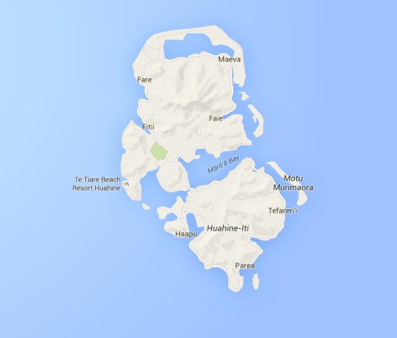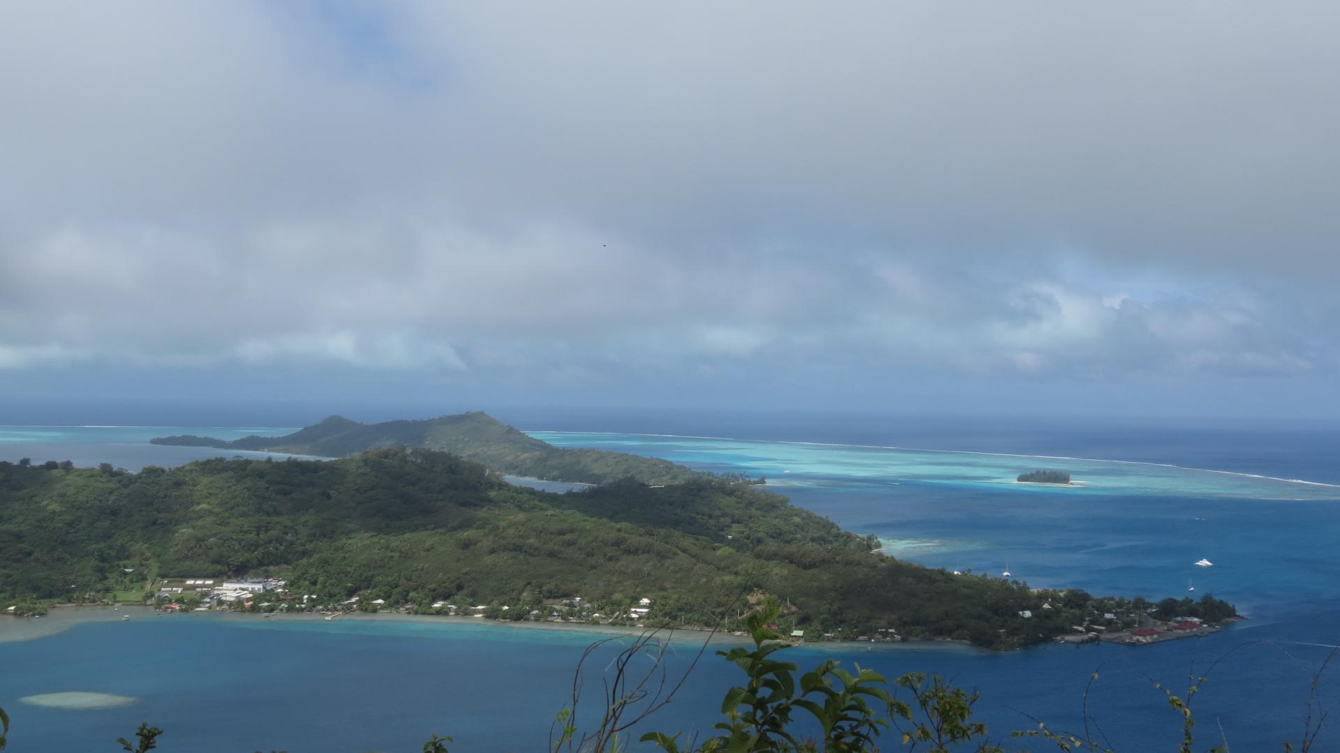 Bien que le ciel soit très nuageux, l’approche en avion vers l’aérodrome de Huahine est superbe et permet d’admirer la beauté et le relief de l’ile. L’ile est situé à 170 km au nord ouest de Tahiti et se compose de deux iles reliées par un pont au niveau des baies de Maroe et Port Bourayne. L’ile est née de trois volcans, dont le point culminant le mont Turi est à 669 mètres. Le mont Tavaiura situé au niveau de la presqu’ile de Fitii ressemble à un visage d’une femme couchée, dont le prolongement d’un buste et d’un ventre arrondi fait pensé à une femme enceinte, pouvant à être à l’origine du nom originel de Huahine (femme enceinte).