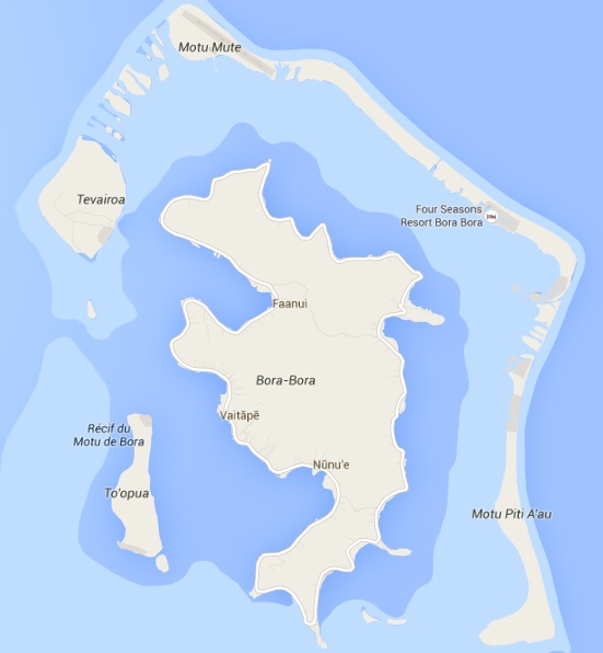 Bora Bora est localisée à environ 255 km au nord-ouest de Tahiti, l'île principale ne mesure que 8 km du nord au sud et 5 km d'est en ouest ; le chef-lieu de l'île est Vaitape. Bora-Bora est formée d'un volcan éteint, entouré par un lagon et une frange de récif. Son point culminant est le mont Otemanu (727 m) situé au centre de l'atoll ; un autre sommet, le mont Pahia, lui aussi situé sur l'île principale, atteint 661 m. Un collier de corail protège Bora-Bora comme une digue. Il s'agit d'un récif-barrière, qui ne présente qu'une ouverture sur l'océan : la passe de Teavanui, située à l'ouest de l'île principale, qui permet à la plupart des gros cargos d'entrer dans le lagon.