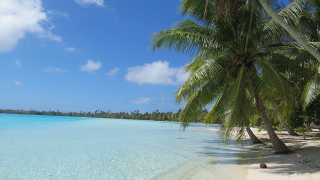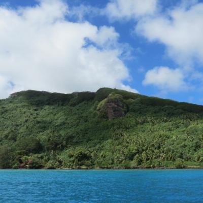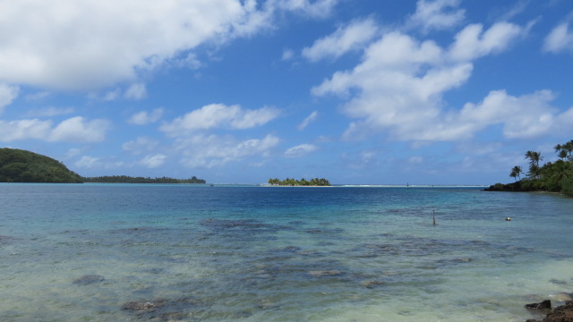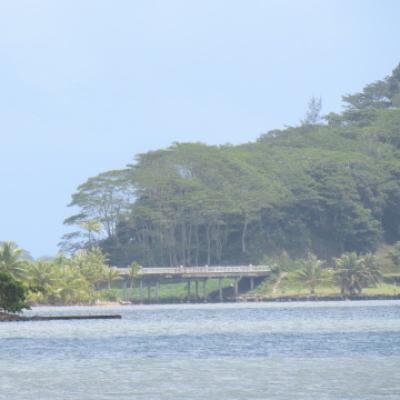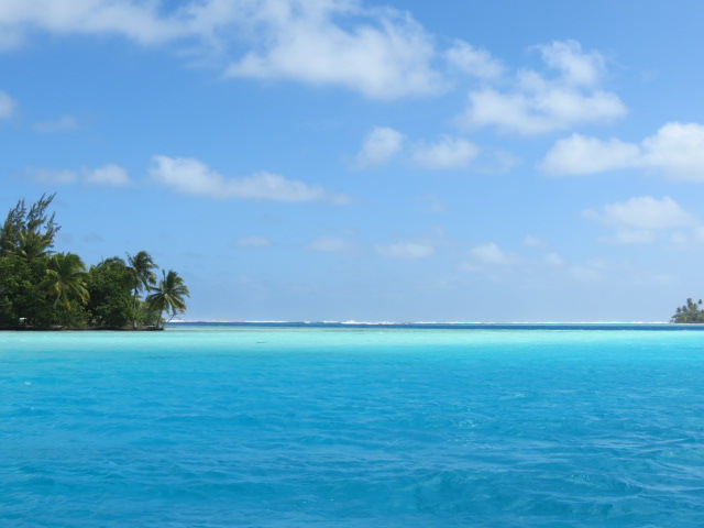 Prochaine étape, Faie célèbre pour abriter dans la rvière qui traverse le village une espèce rare d’anguilles apprivoisées. Les plus beaux spécimens peuvent mesurer deux mètres et sont nourris par les enfants du village. A la sortie du village, un panneau de signalisation indique une côte de 2 km avec un pourcentage supérieur à 15% ! Dur dur la montée, je maudis Juanito qui m’avait dit que les routes de l’iles étaient plates…. On m’aurait menti à l’insu de mon plein grés ! Je termine le second kilomètre à pied, et comme souvent les efforts sont récompensés… En effet le petit col débouche sur le belvédère de Maroe offrant une vue exceptionnelle sur Huahine Iti. Je rejoins rapidement la baie et traverse le petit pont qui relie les deux iles. Le tour de Huahine Iti est beaucoup plus scénique, la route longeant quasiment le bord de mer, offrant une vue imprenable sur le lagon, les nombreuses baies. Nouvel arrêt au niveau de la plage Anini pour visiter le marae du même nom et profiter de la beauté de la plage pour faire une petite pause les pieds dans l’eau. J’ai atteint l’extrémité de l’ile. J’ai fait plus de la moitie du parcours et entame le deuxième raidillon qui m’oblige à terminer la montée à pied. Nouvelle récompense au sommet, la vue du belvédère de Tefare Rii sur le lagon est magnifique, les dégradés de bleu contrasté par le sable d’une blancheur éclatante digne d’une pub de lessive ! Je continue ma remontée de l’ile par la côte est, et apparait au bout du lagon le superbe motu Taiahu qui entoure l’ile jusqu’à la passe Farerea qui sépare les deux iles. La profondeur de la mer étant supérieure à 40 mètres permettant le mouillage de petits paquebots de croisières dans la baie de Maroe et certains jours l’observation de baleines à bosses venant se reposer dans les eaux tranquilles du lagon.