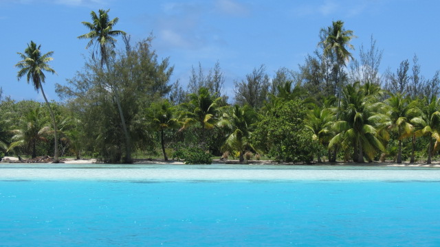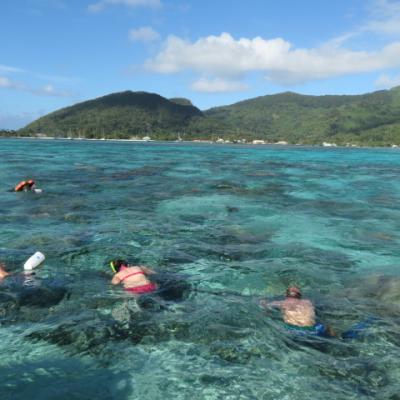 C’est l’occasion d’inaugurer mon nouveau joujou, mon petit appareil photo. Les raies et requins nagent tranquillement sans se soucier de la présence des nombreux touristes essayant comme moi de prendre la photo souvenir… Après être remontés en pirogue, l’embarcation longe les motus de la côte est où se situent la majorité des hôtels de luxe offrant des bungalows sur pilotis sur le lagon. Justin Bieber (star américaine pour midinettes…) d’ailleurs est présent sur un de ces hôtel et vient d’y faire la une… en se promenant nu sur le balcon… les images circulant sur de nombreux réseaux sociaux... La deuxième étape sur un motu (ilot) est consacré à la baignade, bronzette, le temps que l’équipage nous prépare un délicieux repas polynésien composé de poisson cru au lait de coco, filet d’espadon grillé, agrémenté de pain de coco, manioc et de fruits frais de l’ile. Le tour de l’ile arrive à son terme, dernier arrêt au jardin de corail, proche de la pointe Matira. Les fonds coralliens à 2 - 3 mètres de profondeur permettent d’observer une flore et diversité de poissons. La lumière est superbe et le spectacle également.