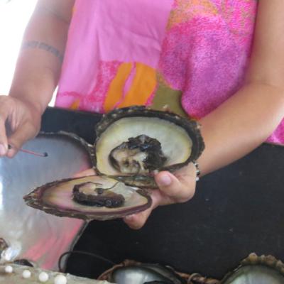 J’avais prévu de consacrer cette journée à faire une randonnée au cœur de l’ile pour atteindre le point culminant le mont Turi. Cependant en raison des fortes pluies de ces dernières semaines, les sentiers sont très boueux voire impraticables. Sur les conseils de Manuela, je décide de réserver une excursion autour des lagons des deux iles en pirogue. Il a encore plus en ce début de matinée, mais d’après les anciens villageois de Faré, les vents ont tourné et le beau temps devrait être de retour...Pourvu qu’ils disent vrai…. Nous sommes une douzaine à embarquer accompagnés de Claude l’assistant de Parka notre guide et pilote… Pourvu que le prénom de notre guide ne nous porte pas malchance côté météo ! Nous quittons donc la minuscule marina de Fare en direction du sud de l’ile, traversé le pont et se retrouver dans la belle baie de Maroe séparant les deux iles ou un petit paquebot de croisière assurant le tour de 7 iles polynésiennes sur une dizaine de jours. Nous remontons désormais la côte est de Huahine Nui pour atteindre en plein lagon l’unique ferme perlière de Huahine. Une rapide mais intéressante initiation aux techniques de greffage des huîtres perlières nous est présentée. Après un passage par la boutique, nous regagnons notre embarcation pour nous diriger sur les côtes est de Huahine Iti.