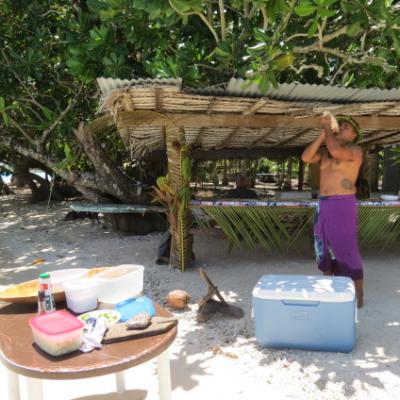 Deuxième arrêt en plein cœur du lagon, au niveau du deuxième jardin de corail de l’ile. Muni de masque tuba et flotteur je me laisser flotter et pousser par les courants du lagon pour observer les fonds marins profonds de deux mètres, riches en coraux et habités pour une belle flore marine. Cette baignade d’une demi heure dans le lagon de Tefarerii nous a ouvert l’appétit ! Cela tombe bien il est déjà midi et le prochain arrêt est proche, situé sur le motu voisin de Taiahu. Après avoir déguster un punch de circonstance, Parka va nous montrer la recette du poisson cru au lait de coco. La recette est finalement enfantine, il suffit juste d’avoir les bons ingrédients et surtout du thon frais ! Nous dégustons cet excellent pique nique les pieds dans l’eau, sur la magnifique plage de sable blanc de l’ilot, incontestablement la plus belle plage depuis mon départ de Los Angeles . Quelques photos, une baignade dans les eaux turquoises du lagon et il est temps de remonter à bord pour remonter les côtes ouest de Huahine Iti.