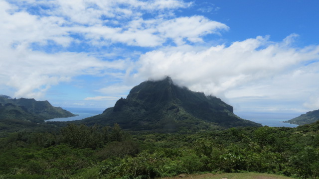 Le temps ne semble pas vouloir s’améliorer, je reprends la route jusqu’au prochain arrêt planifié, l’usine de jus de fruits de l’ile. J’en profite pour y visiter la boutique et faire une dégustation de vin d’ananas, de liqueur d’ananas et de jus d’ananas… La variété d’ananas est voisine de l’ananas Victoria de l’ile de la Réunion. Comme par magie la pluie a cessé… C’est de bonne augure pour reprendre la route, direction la baie d’Opunohu, réputée pour la qualité de son mouillage, lieu où débarquèrent les premiers européens en 1769. Au fond de la baie un petit chemin goudronné mène au site archéologique d’Opunohu et du belvédère du même nom offrant une magnifique vue sur les 2 baies séparées par le mont Rotui, dont le sommet à 900 mètres est le plus élevé de l’ile.