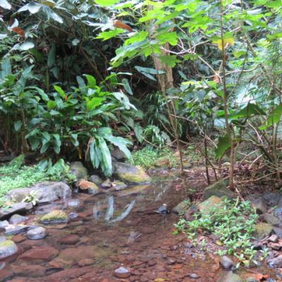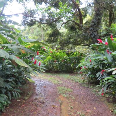 J’enfourche donc un vélo afin de me rendre au départ du sentier de randonnée qui mène au col des 3 cocotiers. L’accès est également proche de la maison d’hôte et les 3 premiers kilomètres sont aisément accessible en vélo ou 4X4. Je fais le dernier kilomètre à pied, laissant mon vélo dans les fougères, la nature y est superbe et comme partout sur l’ile exubérante. Arrivé au gite, marquant l’ascension au col, je fais demi tour, la pluie va m’accompagner jusqu’à la chambre d’hôte.