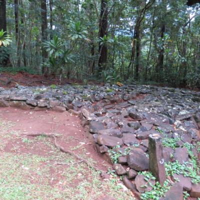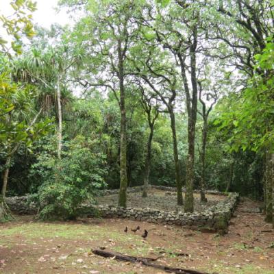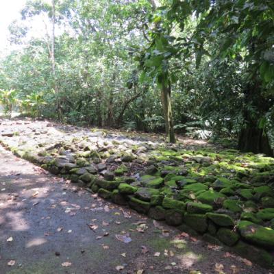Revenons cependant au site archéologique. C’est l’occasion pour avoir notre petit cours d’histoire quotidien. Ce site archéologique est le plus important de l’ile. En plus de la présence de maraés ce site a la particularité d’avoir également la présence de deux plateformes de tir à l’arc. C’est un ouvrage trapézoïdal en pierres de basalte. L’architecture se caractérisant par la forme concave de la partie frontale, avec des pierres dressées à chaque angle de la plateforme. Un espace non pavé en forme de T délimitant l’aire de déplacement et de tir de l’archer. Au centre une ou plusieurs pierres marquent le pas de tir.