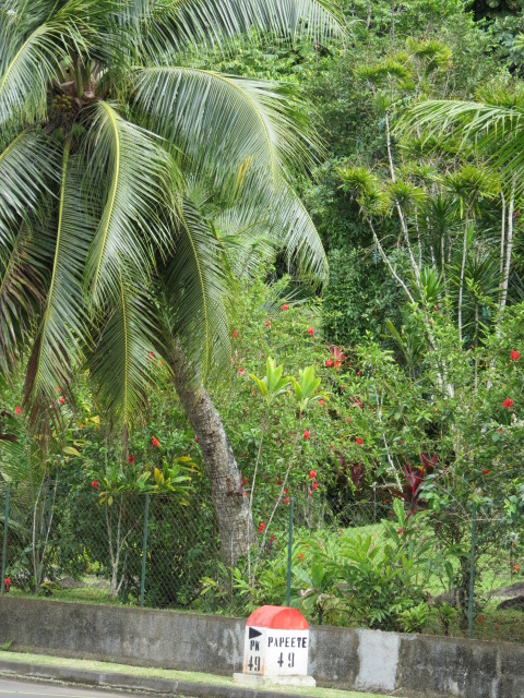 Bon le programme du jour, c’est la route du Monoi, ou tout simplement le tour de l’Ile ! 114 km sur la partie Tahiti Nui et 35 km sur la presqu’ile de Tahiti Iti. Le repère se faisant par des bornes kilométriques dont le kilomètre 0 débute à Papeete. Pa’ea la petite commune où se situe mon studio se situe au km 22,5. Direction le sud avec un premier arrêt au km 49, où se situent les Sources et bains de Vaima ainsi que les Jardins d’Eau de Vaipahi. C’est un très beau site à flanc de montagne, un joli jardin très bien fleuri en cette période de l’année a été aménagé et ornementé par le cours d’eau et quelques bassins. Des sentiers de randonnées balisés le long des cascades partent également depuis les jardins.