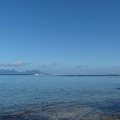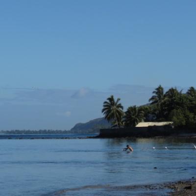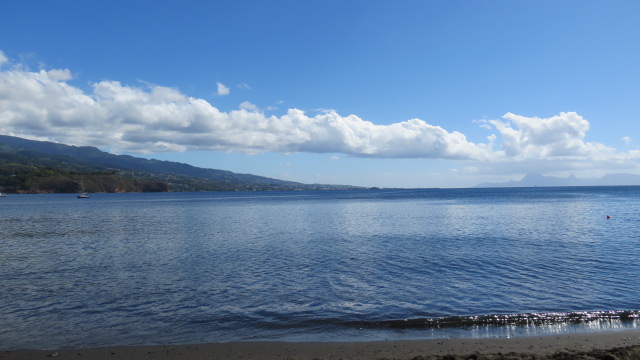 Je traverse rapidement Papeete, sachant que j’y retournerai à minima pour y dormir dans une dizaine de jours, afin de redescendre sur la côte ouest et rentrer à Pa’ea. Une dernière halte, cette fois ci au supermarché pour faire le plein du réfrigérateur dans une célèbre grande surface dont l’enseigne a comme synonyme croisement et slogan publicitaire « j’optimisme! ». Et bien pour ma part je « pessismisme » quand je vois le total à payer et ce que j’ai dans mon cabas. Bienvenue dans l’ile où la vie est plus chère… Le yaourt à pratiquement 1 Euro (où 120 Francs Pacifique) l’unité… bref les produits frais sont hors de prix, il est vrai importés de métropole ou d’Australie et de Nouvelle Zélande… transportés par en avion… Seuls les produits « secs » type conserves, biscuits… sont à des prix relativement raisonnables…. Bon je ne vais pas non plus plaindre le polynésien, qui même sans avoir la main verte voit pousser dans son jardin cocotiers, bananiers et autres manguiers, n’a pas de facture de chauffage à payer ni de chaussures à acheter, une paire de tongs étant plus que suffisante ! et habite dans une ile jardin botanique grandeur nature ! entourée de lagons aux eaux tièdes et cristallines. Vous l’aurez compris la Polynésie n’est pas une destination routard… Je regagne mon studio. Le temps en ce milieu d’après midi est agréable, par rapport à ce début de journée grisâtre sur la partie sud. J’enfile mon maillot de bain et direction la plage située à 30 mètres. La plage bien que publique ne disposant que de servitude est de ce fait comme privée. Je suis l’unique privilégié à profiter de ce cadre paradisiaque. Le sable par rapport à la majorité des plages de l’ile est blanc et la vue de ma serviette de bain donne sur le lagon et l’Ile de Moréa en toile de fond. Bref pas mal, même si la température de l’eau est un peu fraîche à mon goût ! Cependant je crois que c’est la première fois que je me baigne dans l’Océan Pacifique. Belle agréable fin d’après midi pour conclure cette première journée ….