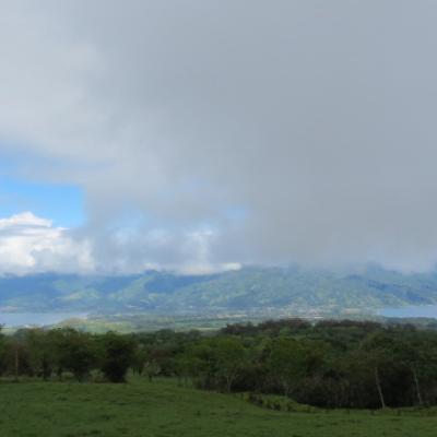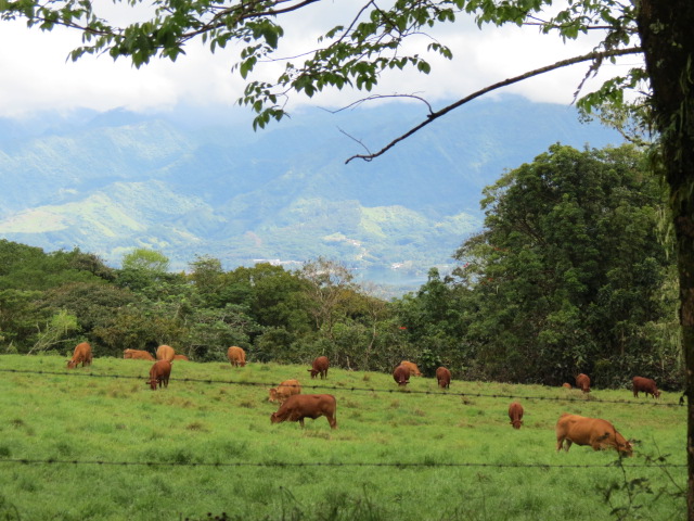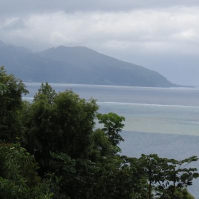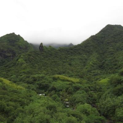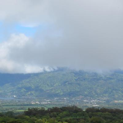 Sortie matinale, profitant du beau temps relatif pour me rendre à nouveau au sud de l’ile, sur les plateaux de Taravao. Lors de mon précédent tour de l’ile, j’avais volontairement évité cette route en raison du mauvais temps présent au sud de l’ile. Je tente ma chance ce matin, c’est maintenant où jamais me rendant compte que depuis le début de la semaine, le mauvais temps arrive des montagnes en début d’après midi. La route au sud de l’ile est détrempée, il a dû tomber des cordes la nuit passée. C’est fou la différence de climat sur une trentaine de kilomètres… cependant le ciel est encore relativement dégagé et lumineux. Arrivé au sud de Tahiti Nui, je me rends donc sur la presqu’ile Tahiti Iti. Au bout d’une petite route et de 10 km de montée, j’ai l’impression de me retrouver dans un bocage normand avec les nombreux pâturages et fermes laitières… (et la météo est finalement proche !) J’atteints le belvédère du plateau. Le panorama sur l’isthme de Taravao et de Tahiti Nui est superbe malgré les nuages accrochés aux flancs des montagnes.