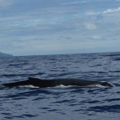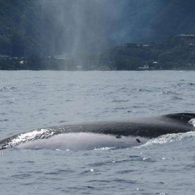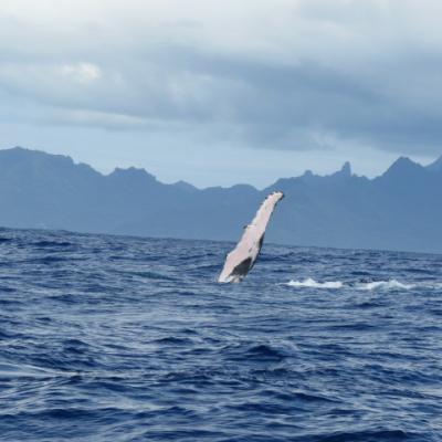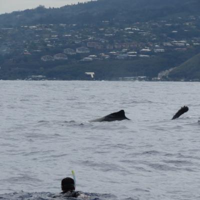Nous sommes 6 à prendre part à la balade, accompagnés d’Eric le biologiste et Cyril le pilote du hors bord. Après une première demi heure infructueuse, durant laquelle Eric va nous présenter les caractéristiques de la baleine à bosse qui mesure à taille adulte de 14 à 19 mètres de long et pèse jusqu’à 30 tonnes, de leur migration annuelle pour venir donner naissance d’un bébé baleineau de 3 mètres et de 900 kilogrammes... dans les eaux chaudes de la Polynésie, Cyril repère 2 cétacés. Eric estime que nous pouvons nous mettre à l’eau afin de pouvoir les observer. Le temps d’enfiler combinaison, masque tuba et palme, bref tout l’équipement du plongeur néophyte ! Et de plonger ! Les 2 baleines se sont fait la belle ! Pas de problèmes 10 minutes plus tard un peu plus au large, 4 baleines sont repérées… nouvelle plongée mais finalement la baleine femelle agacée par le combat des trois males part au large suivi des males qui continuent leur bagarre pour savoir lequel sera l’heureux élu. Nous remontons dans le bateau nous étions à 20 mètres des baleines mais trop loin cependant pour les voir sous l’eau malgré la clarté de l’eau. La houle commence à se former, le petit déjeuner du matin certainement pris à tort additionné à la houle du large, j’ai l’estomac barbouillé.