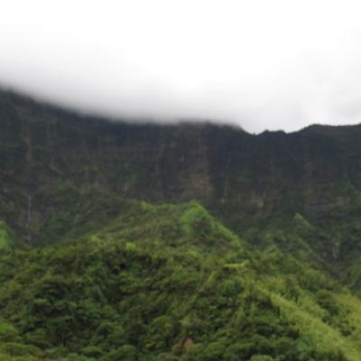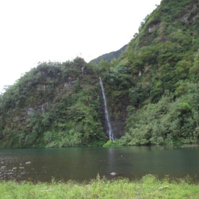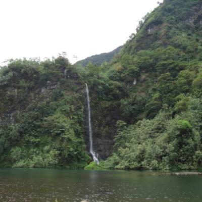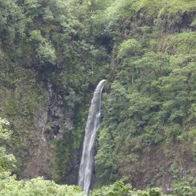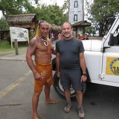 Départ ce matin pour une excursion au cœur de l’Ile. Une piste permet de traverser l’Ile en son milieu en partant du nord au sud ou vice versa par la vallée de Tepanoo. Ce n’est pas ma vaillante petite Twingo qui va pouvoir rouler sur ces routes réservées aux 4X4. Je n’ai donc pas le choix que de passer par une agence. Caro et Bruno me conseillent de faire appel à l’oncle de leur gendre qui assure ce genre de prestation. Je rejoins donc Teiva (c’est son prénom) au point de rencontre fixé à l’entrée de Papeete. Impossible de le rater, Teiva arrive avec son Land Rover et vêtu uniquement d’un pagne traditionnel, arborant fièrement sur son corps nombreux tatouages. Nous récupérons au passage à la gare maritime, 3 couples, d’américains, canadiens et australiens débarquant pour la journée d’un paquebot en provenance d’Hawaï. Une vingtaine de kilomètres au nord de Papeete se situe l’entrée de la route de la vallée. L’intérieur de l’île est très luxuriant et accidenté. La route va rapidement se transformer en piste qui longe la rivière Papenoo et sa vallée sur environ 18 km. C’est la seule voie qui traverse l’ancien cratère. Nous traversons à plusieurs reprises sur des radiers en ciments ou petits ponts la rivière. Se succèdent plusieurs cascades le long du trajet : Topatari, Vaiharuni et Puranah ainsi que deux petits barrages permettant la production de 50% d’électricité nécessaire aux besoins de l’île. Nous arrivons pour le déjeuner au Relais de la Moroto en plein cœur de l’île. La vue de la terrasse panoramique du restaurant offre une vue imprenable sur les principaux sommets de l’île qui sont malheureusement sous les nuages. On se croirait dans un décor de Jurassic Park…