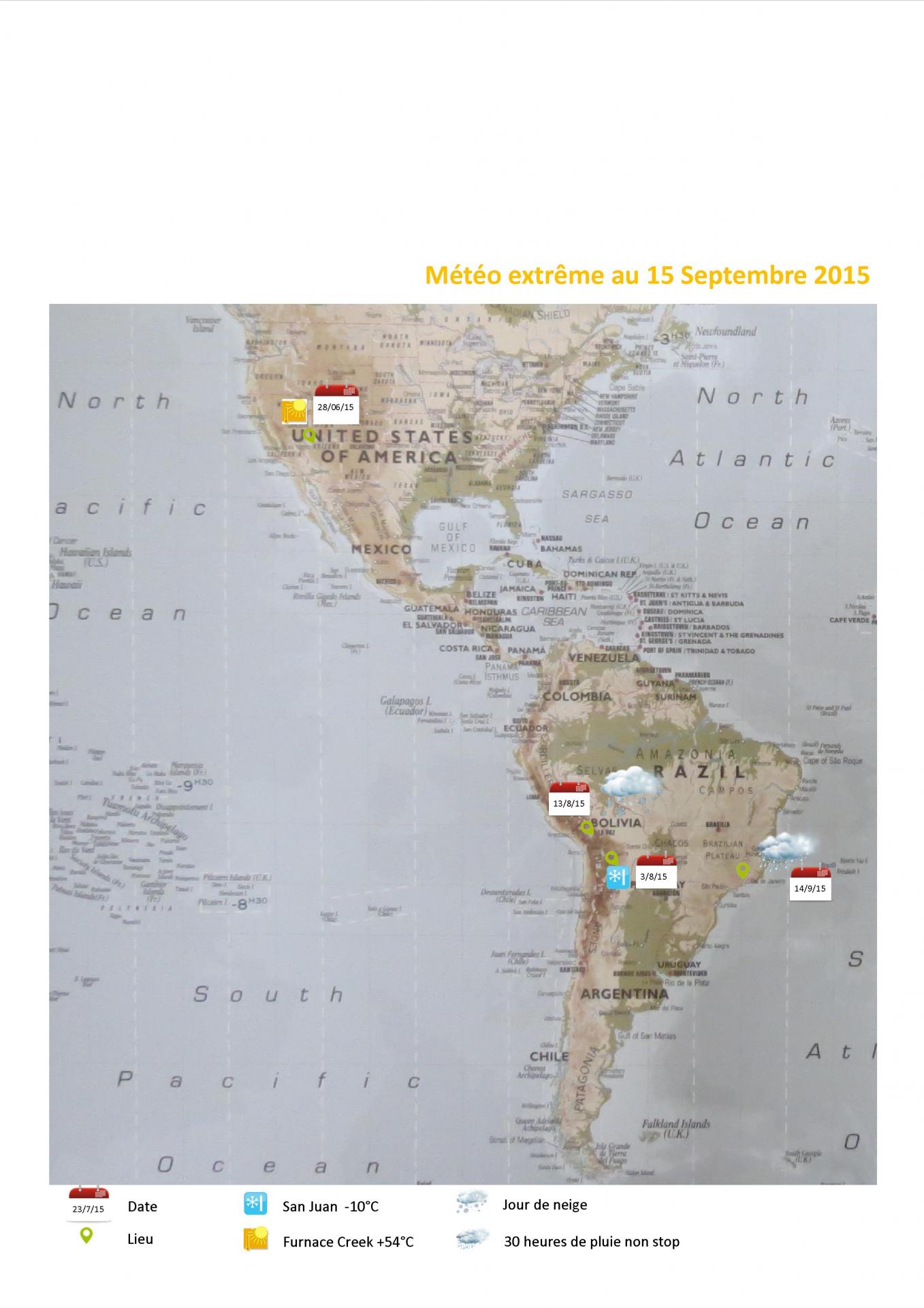 Je vous laisse à présent découvrir en réel obsédé, mais vous vous en êtes aperçu à la lecture de mes billets, mon relevé météorologique ainsi que ses extrêmes du -17°C à Pékin à +54° à Furnace Creek dans le désert du Nevada, sans oublier une belle frayeur à Santiago du Chili avec un séisme d’une magnitude de 8,3 sur l’échelle de Richter…