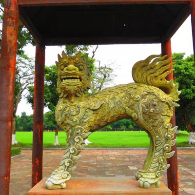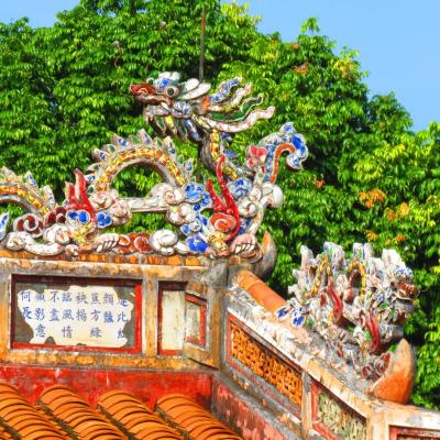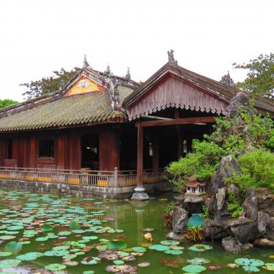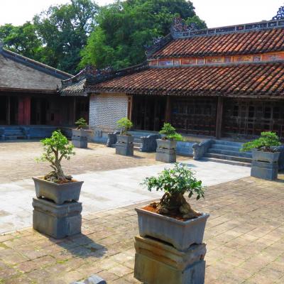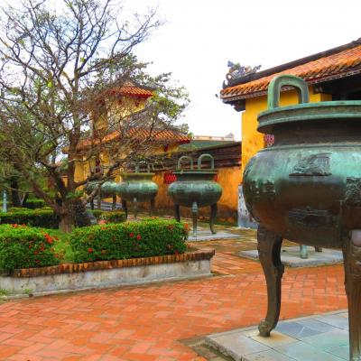 Au sud de la cité, le superbe complexe de temples Thai To Mieu, récemment restaurés, et les neufs urnes dynastique du pavillon de la Splendeur, merveilles d'émaux, de sculptures et de couleurs. Je termine ma visite par la Cité pourpre interdite où vivaient l'empereur et sa famille, des temples, des jardins de détente, un théâtre et des points d'eau complètent l’ensemble. C’est la partie de la cité paradoxalement la moins intéressante, une grande partie des bâtiments ayant été détruits durant les dernières guerres. Cependant de nombreux travaux de restaurations ont débuté.