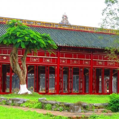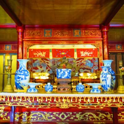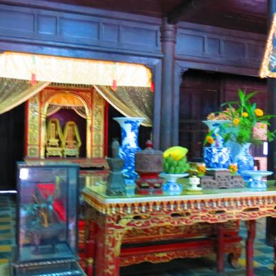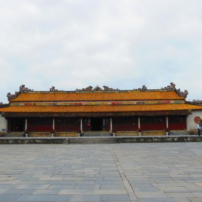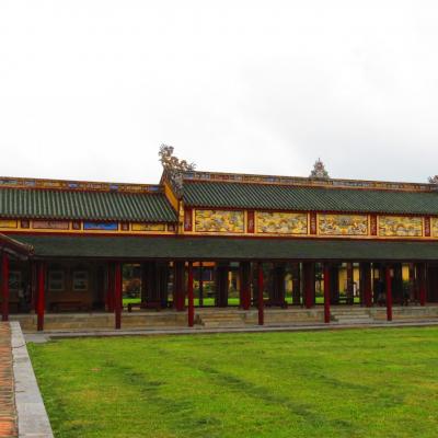 Juste après avoir franchi la magnifique porte Ngo Mon, se dresse le palais de l'Harmonie suprême, vaste salle, où l'empereur présidait les cérémonies et recevait des invités de marque. Cette salle est éblouissante de couleurs et de richesses, les murs et les colonnes en bois de teck laqué rouge et or sont gravés de poèmes en caractères chinois. Le trône en bois laqué doré sur lequel montèrent les 13 empereurs de la dynastie Nguyen y est également exposé. Je continue ma visite me retrouvant dans une cour entourée de deux bâtiments jumeaux, les Halls des Mandarins,  les bâtiments officiels d'où l'on gérait l'empire.
