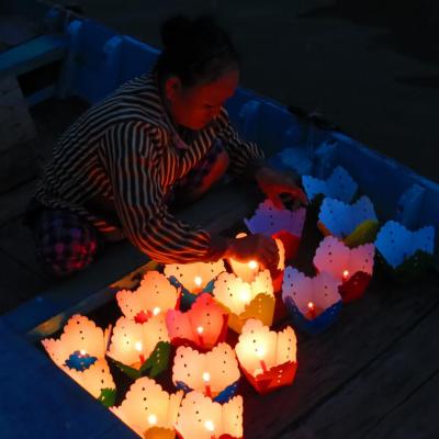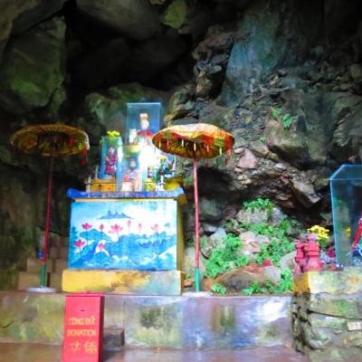 Nous passons une excellente soirée à discuter de voyages et de conseils divers et variés sur nos prochaines étapes. Deux autres couples franco belges sont attablés à nos côtés, décidemment c’est la soirée de la francophonie ! Le restaurant ferme ses portes, il faut quitter les lieux ! C’est la pleine lune et nous restons quelques instants à observer la propriétaire du restaurant au cérémonial de remerciement des esprits composé d’offrandes (fruits, gâteaux…) , brûler des bâtonnets d’encens, des liasses de faux billets et de lingots d’or devant son magasin. Les vietnamiens implorent également par ce rituel la chance et l’afflux de clients !