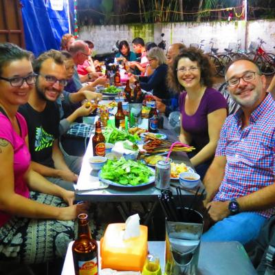 Nous sélectionnons un restaurant traditionnel mentionné en commun sur nos guides respectifs, et je dois reconnaitre que n’étant pas toujours d’accord avec ce genre de recommandations que cette fois ci nous avons fait une excellente pioche. Nous apprenons à réaliser nous même les rouleaux de printemps d’Hoi An, composés de feuilles de riz, légumes, brochettes de porc, crêpes épaisses farcies aux crevettes… Un vrai régal d’autant plus que l’équipe du restaurant est fort sympathique….