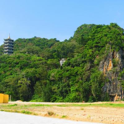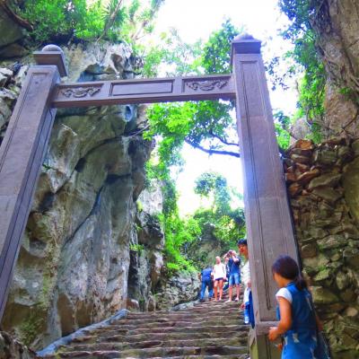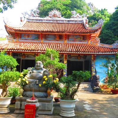 Mais revenons à notre montage de marbre. C'est en réalité un ensemble de cinq collines calcaires qui se dressent au-dessus de la plaine. Chacune de ces collines porte un nom différent qui leur fut attribué par l'empereur Gia Long de la dynastie des Nguyen selon les différents éléments qui composent la planète. On distingue ainsi Thuy Son (le mont de l'eau), Moc Son (le mont du bois), Hoa Son (le mont du feu), Kim Son (le mont du métal) et Tho Son (le mont de la terre). Le lieu comme souvent au Vietnam est sujet à une légende. Celle-ci raconte qu'un dragon de mer vint sur la plage pour y pondre un oeuf. Au bout de 1 000 jours et 1 000 nuits, l'oeuf finit par s'éclore. Une belle jeune fille en sortit puis s'envola vers les cieux tandis que les fragments de la coquille grossirent jusqu'à former les cinq collines des Montagnes de marbre.