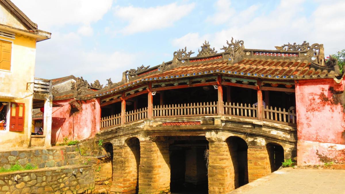 Sorti de l’agitation du marché, les ruelles en cette matinée sont relativement calmes. Je traverse aisément le superbe pont pagode japonais, construit en 1593, afin de relier les quartiers chinois et japonais. Ce sont finalement les Japonais, établis à l'ouest de la rivière, qui entreprirent la construction de ce pont couvert. Cela prit trois ans, de l'année du singe à celle du chien, d'où la présence de part et d'autre du pont de statues représentant ces animaux.