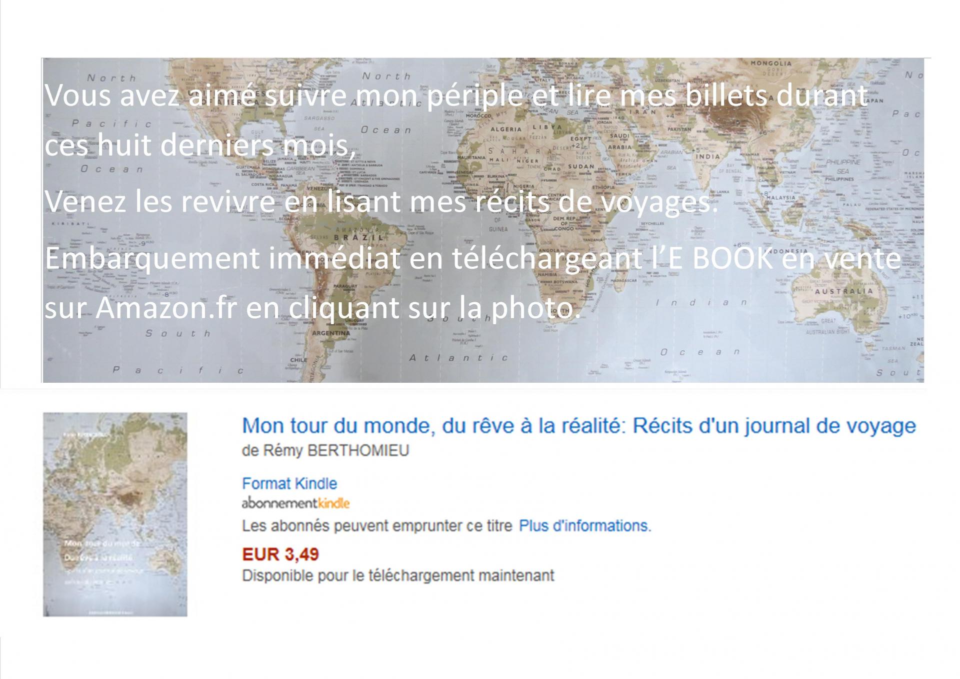 Retrouvez tous mes récits de voyages, et de nombreuses photos de la genèse du tour du monde au retour à la réalité. L'EBook est en vente sur le site d'Amazon en cliquant sur le lien au prix de 3,49 Euros.